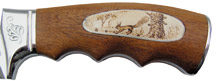 Корр. – Какой материал вы предпочитаете использовать в своих ножах? В. – Традиционные материалы, дающие гарантию качества и не вызывающие сомнения среди охотников и любителей ножей. Для клинков это нержавеющая сталь 95X18, обладающая высокой прочностью на излом и одновременно способная существенно увеличивать показатель твердости при термообработке. К тому же эксплуатация на охоте ножей из этого материала не вызывает сложностей из-за высокой устойчивости такой стали к коррозии. Для рукоятей ножей предпочитаю дерево и кость. Эти материалы красивы, приятны «на ощупь». Именно эти материалы позволяют применить в декоративном оформлении ножа техники, создающие у владельца ощущение традиционности этого предмета. А ведь охота – это одно из самых традиционных занятий человека, и все предметы, имеющие к ней отношение, должны быть носителями выработанных в течение длительного времени признаков охотничьего классицизма.
