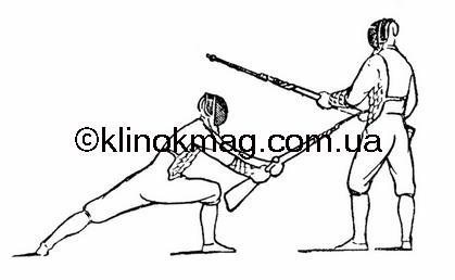При этой атаке с дальней дистанции, с шагом вперед, целесообразно обманное движение — угрозу прямого укола — сделать вместе с шагом вперед, а укол с переводом выполнить вместе с выпадом. Необходимо иметь в виду, что быстрота этой атаки должна в ее процессе возрастать, т. е. укол переводом должен быть быстрее показа обмана.