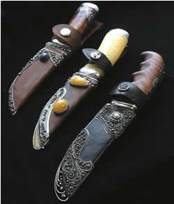 Форма лезвия и рукоятки разработаны Василием Ивановичем и лежат в основе совершенства, которым являются его изделия. А довершает цельное впечатление красоты – украшение их кожей, камнем, резьбой и драгоценными металлами в соответствии с традициями Украины.