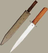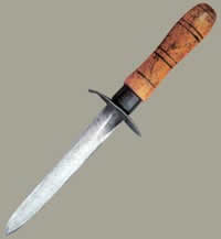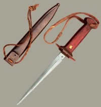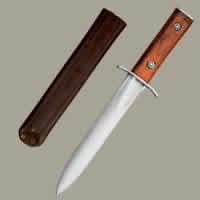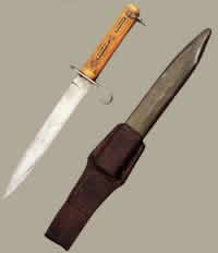 Пожалуй, первым специально изготовленным боевым ножом стал французский М 1916 или «Венжер 1870» – «мститель», названный так в память о поражении в конфликте с Германией в 1870 г. Он имел «родные» металлические ножны с проволочной дужкой, позволявшей закреплять его на поясном ремне. Французская компания «Роддье и Дозольм» приступила к его выпуску 7 октября 1915 г. Затем к его изготовлению подключились другие ножевые фирмы, что позволило обеспечить им французскую армию в короткий срок. Официальное описание французского боевого ножа, или правильнее сказать кинжала, было следующим: «обоюдоострое лезвие ромбического сечения из сверхпрочной, так называемой сабельной стали заканчивается стержнем с винтовой нарезкой; гарда и гайка стрежня из мягкой стали; рукоятка из прочного дерева, втулка на рукоятке из полутвердой стали; ножны – из согнутого и запаянного листового железа, входное отверстие с перекрестно расположенными штампованными ребрами для поддержки лезвия; нож и ножны помечают клеймом фирмы-поставщика».