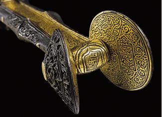 Одним из наиболее характерных «ущастых» изделий, относящихся к холодному оружия, является классический турецкий ятаган. Ятаганом принято называть большой кривой турецкий кинжал. Это клинковое колюще-режущее и рубяще-режущее холодное оружие с длинным однолезвийным клинком. Небольшая масса оружия (около 800 г) и достаточно длинный клинок (около 65 см) позволяет наносить рубяще-режущие и колющие удары. Форма рукояти не дает оружию вырваться из руки при рубящем ударе. Металлический доспех высокой степени защиты ятаганом пробить проблематично ввиду небольшого веса и конструктивных особенностей клинка.