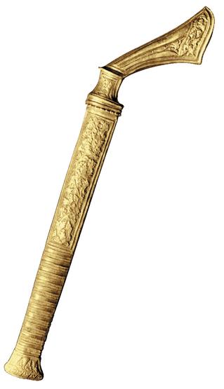 Еще более разнообразны рукояти. Самыми распространенными являются рукояти в виде головы зверей и птиц, которые могут быть очень натуралистичными, а чаще настолько стилизованными, что почти нельзя определить, что они собой представляют.