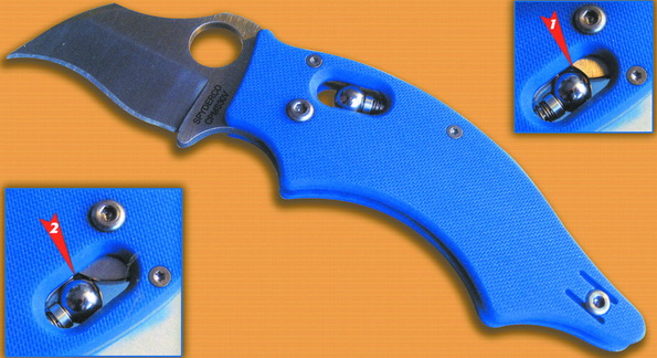 В раскрытом ноже с шариком корреспондирует уже противоположное, со стороны обушка, вогнутое плечо пяты клинка. При попытке сложить нож простым давлением на клинок данный секторный вырез надавливает на шарик, отжимая его вверх-вперед и препятствуя, таким образом, непроизвольному закрытию ножа на пальцы пользователя. Чтобы сложить нож, необходимо несколько оттянуть шарик назад.