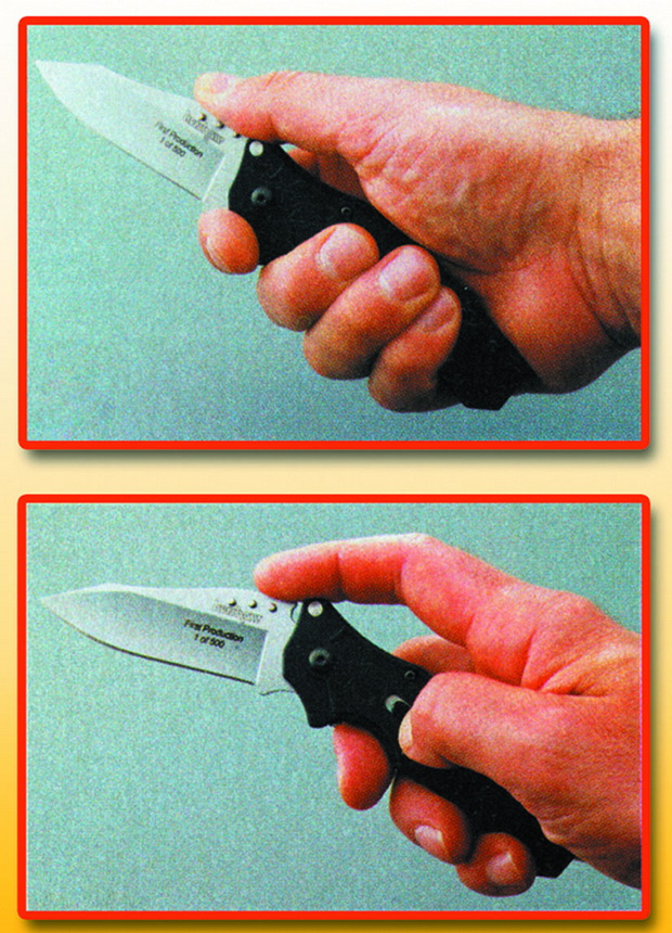 Весьма характерна форма клинка. Острие сильно спущенное, фальшлезвие образует характерную «ступень». В соединении с двумя подпальцевыми выемками на рукояти со стороны лезвия и одной со стороны обуха такая форма клинка позволяет пользователю выбирать между различными хватами ножа, с наложением большого пальца вплоть до «ступени».