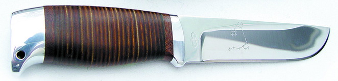 Такая конструкция говорит в пользу высокой прочности ножа, несмотря на максимальную толщину клинка 2,4 мм, которая в данном случае является оптимальной — ведь нож предназначен преимущественно для режущих работ по мягкому материалу, хотя при необходимости им можно заострить колышек, срубить ветку, благо вес и прочность ножа позволяют это сделать. Форма рукояти с равномерным плавным изгибом брюшка рассчитана для удобства выполнения режущих операций при прямом хвате ножа, как лезвием вниз, так и лезвием вверх. К недостаткам конструкции ножа можно отнести разве что отсутствие отверстия для темляка. В комплект поставки ножа входят удобные кожаные ножны.