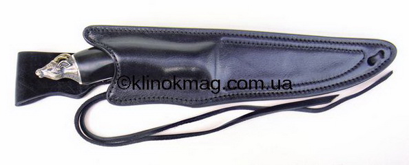 Особой деталью является чехол, изготовленный из натуральной кожи. Внутри него имеются вставки из термопласта, что позволяет максимально точно повторить силуэт рукояти. Это очень практично: без дополнительных средств фиксации нож держится в чехле великолепно и входит в него полностью с характерным щелчком. Чехол оснащен верхней петлей для поясного крепления на «серьге» и нижними шнурками для набедренного крепления.