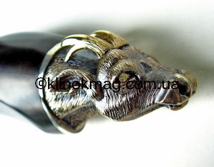 Используемые материалы: дамаск, эбен, серебро — 85 г, золото — 10 г, желтые бриллианты.